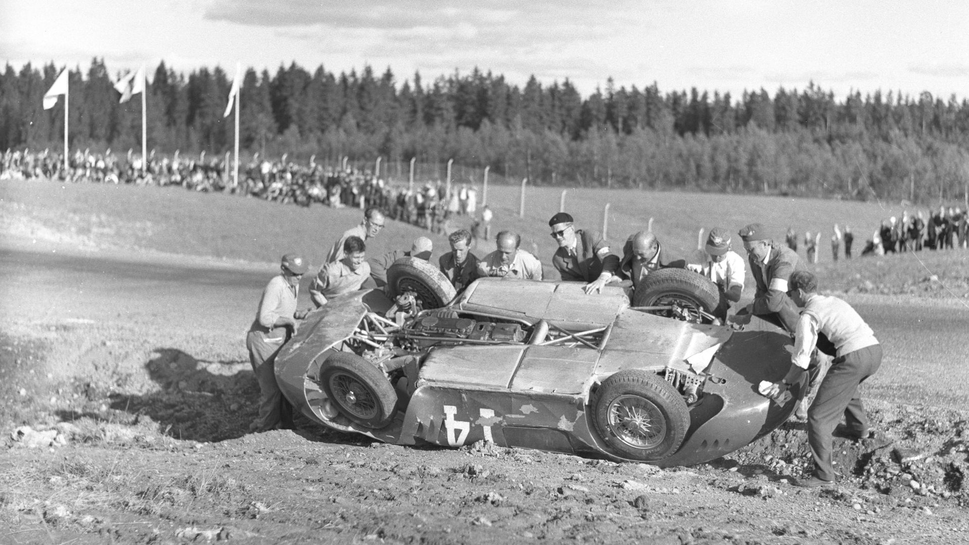 A corrida de Le Mans de 1955 tornou-se o palco do acidente mais fatal da história do automobilismo quando ocorreu um enorme acidente duas horas após o início. Quando Mike Hawthorn parou o seu Jaguar nos boxes, os pilotos que vinham atrás dele estavam indo rápido demais para evitá-lo, causando um engavetamento que resultou no Mercedes de Pierre Levegh pegando fogo. As peças do seu carro foram lançadas para a multidão, resultando na morte de 77 espectadores.