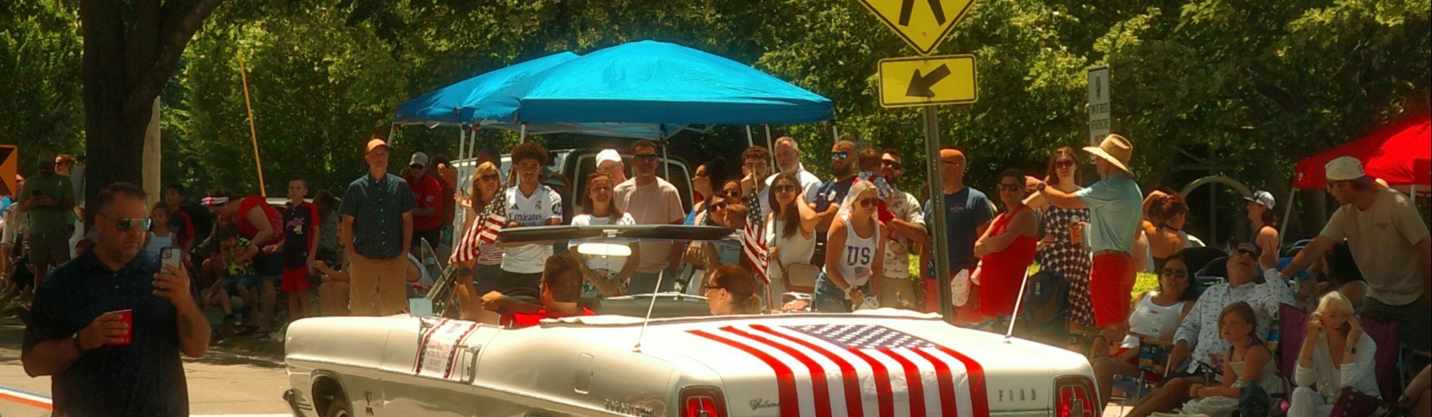 A parade route turns the car into a public version of the driver. The decorated pickup and the polished convertible each project their own kind of local personality, and both end up saying almost as much as the people waving from them.
